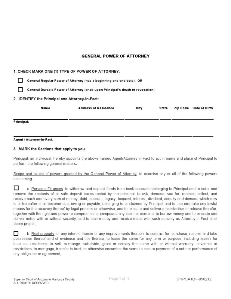 The Arizona General Power of Attorney is used in the state of Arizona when the grantor or the principal wants to appoint someone else (the attorney-in-fact) to make decisions on his behalf. You may specify the scope and powers which you want to grant the attorney-in-fact by selecting the options such as Real Property, Personal Finances, personal property or any kind of business transaction.